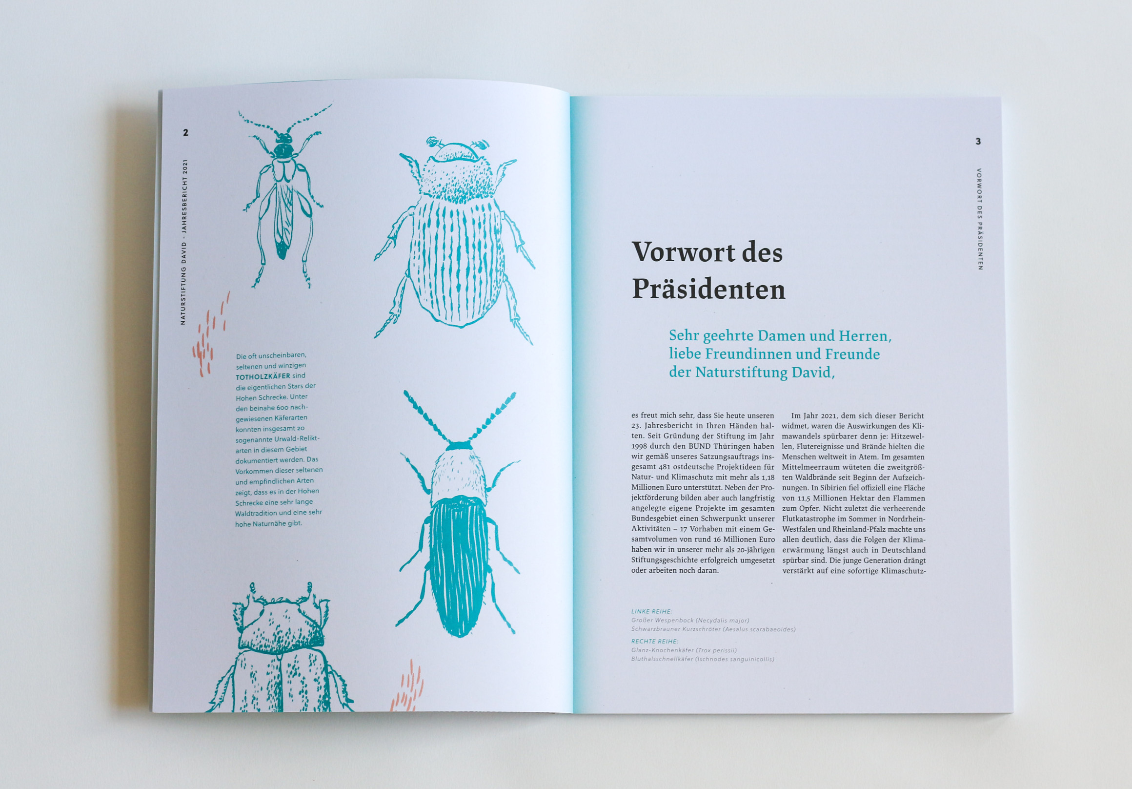 Seit fast 25 Jahren beauftragt die Naturstiftung David junge Grafiker:innen mit der Gestaltung ihres Jahresberichts. Die Ausgabe für das Jahr 2021 durften wir gestalten.