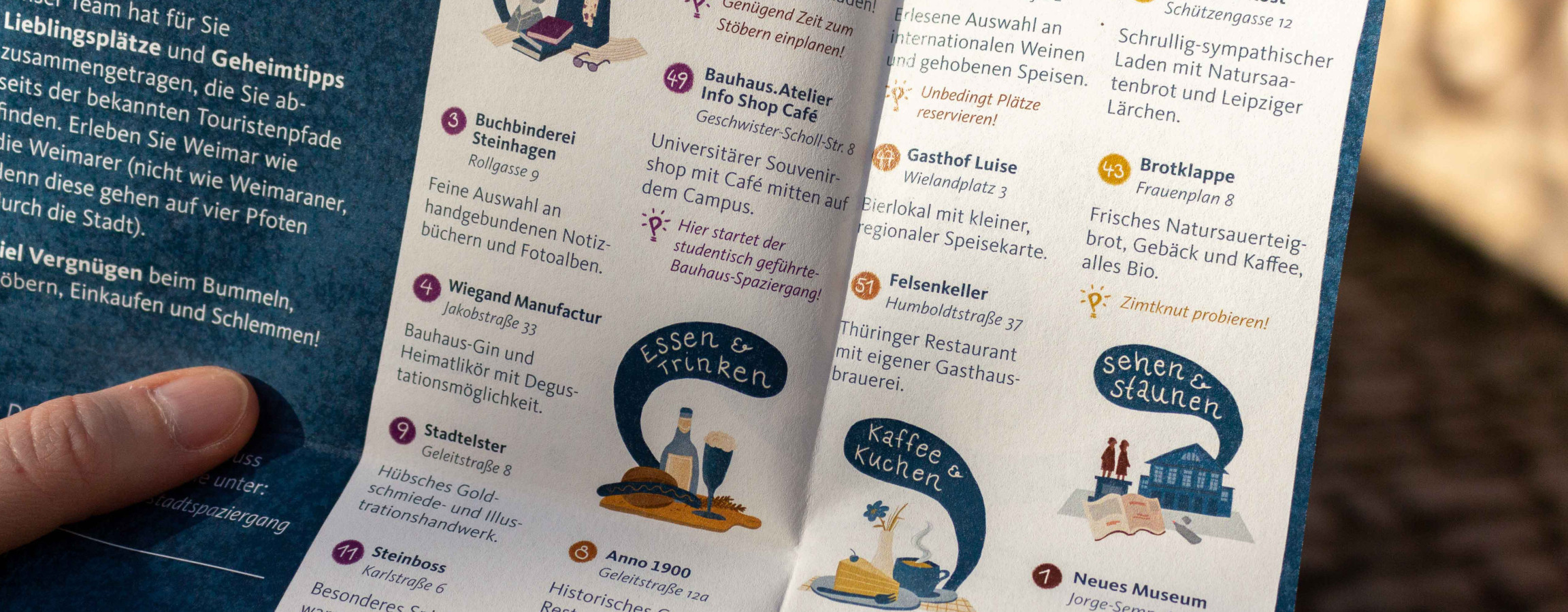 Die Idee für einen Stadtplan mit Weimarer Lieblingsorten entstand im Team. Wir übernahmen Gestaltung und Umsetzung. Wie in einem Wimmelbild gibt es diverse Orte und lokale Tipps zu entdecken, die mal mehr, mal weniger albern daher kommen. Auf der Rückseite sind die von uns kuratierten Lieblingsorte des Papenfuss-Teams kurz beschrieben und nach Kategorien sortiert. Damit der Stadtplan lange haltbar ist und auch verregnete Weimar-Besuche übersteht, wurde er wie die alten Führerscheine auf Neobond-Papier gedruckt und ist somit auch haptisch ein außergewöhnliches Produkt.